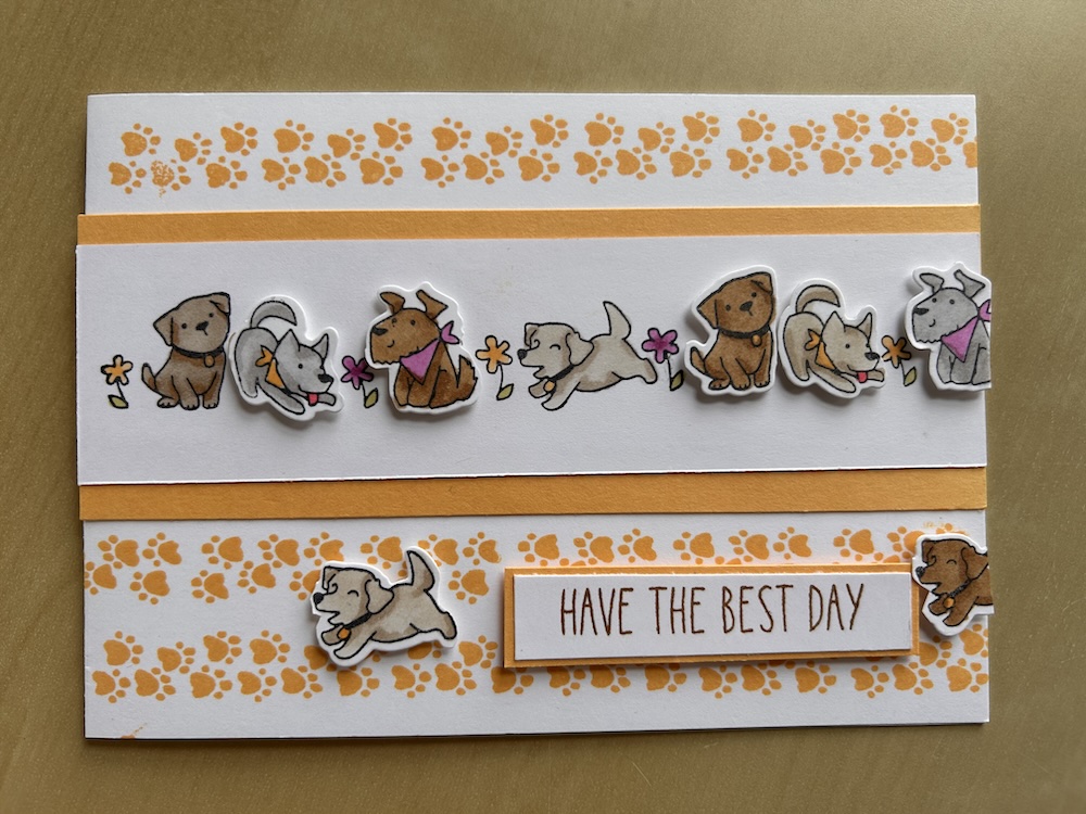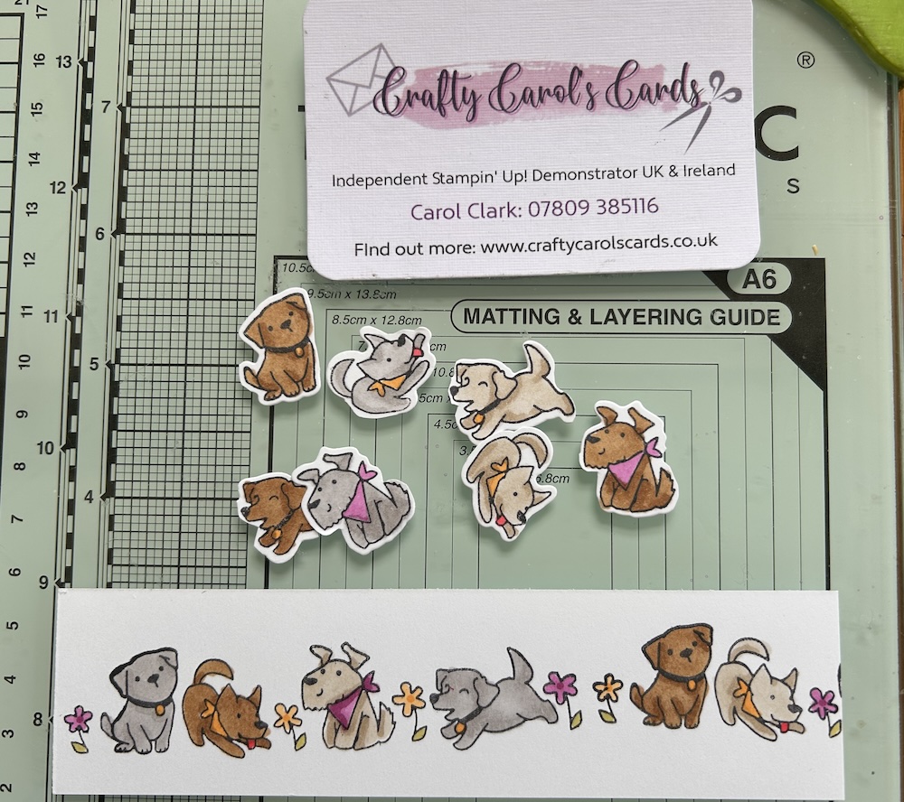 There is quite a lot of colouring, but this gorgeous stamp set/bundle is worth it. I’ve used the dogs stamp, but you could use the cats or birds to make a similar card – or use any other strip-type stamp set!