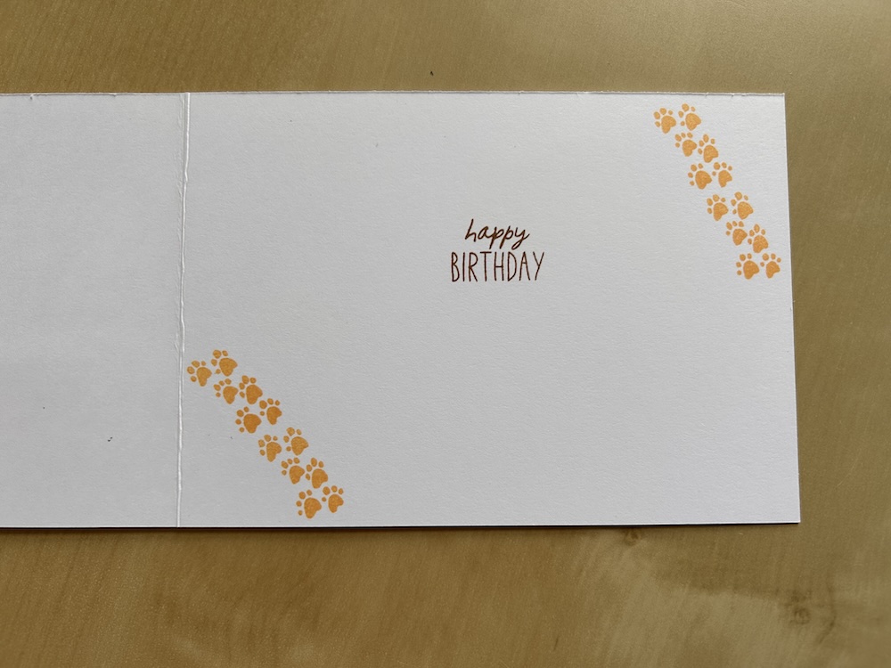 Stamp the paws across the bottom and top of the card using Peach Pie ink, stamped off if you prefer – your choice as to whether they all go the same way or different ways! Use this stamp to decorate the inside of your card and the envelope, too.