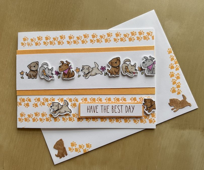 Stamp the paws across the bottom and top of the card using Peach Pie ink, stamped off if you prefer – your choice as to whether they all go the same way or different ways! Use this stamp to decorate the inside of your card and the envelope, too.