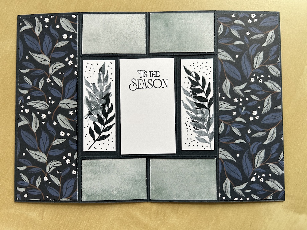 For the back, I added six more pieces of DSP cut using the Layer 1 measurements. I added three Basic White panels across the centre of the card cut (again using the layer 1 measurements) for stamping another sentiment and writing my greeting. Then I added further decoration with a leaf stamp from another set, stamped off. on the two side panels I added a few dots with my Secret Sea stampin Write marker to these panels too: