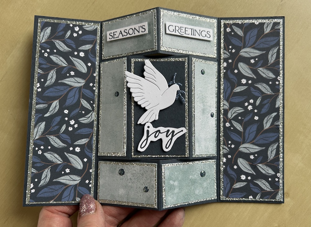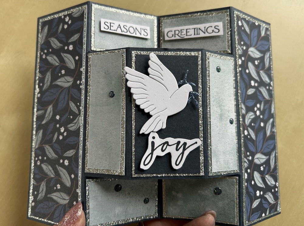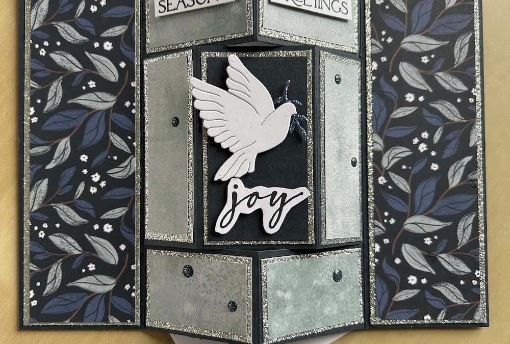 I used the gorgeous Peaceful Garden DSP, with sparkle from the Peaceful Garden glimmer paper on a Secret Sea card base. I also used a die-cut dove and the tiny branch from the Peace of Earth dies plus some low profile sparkle dots for decoration. I used retired stamps for the sentiments (Brightest Glow).