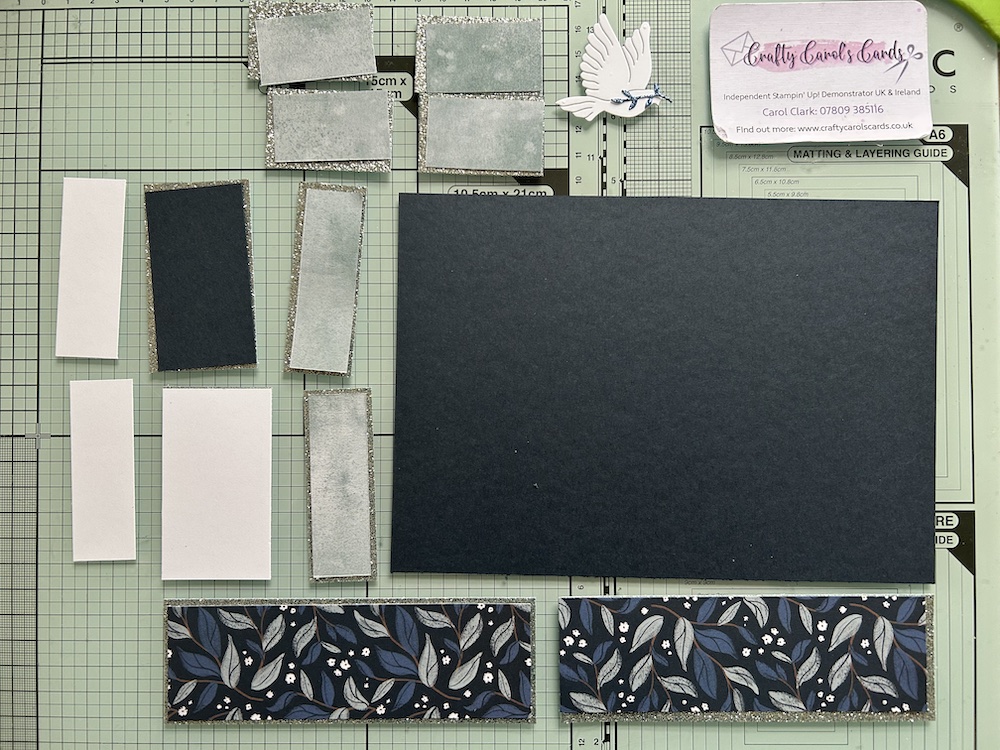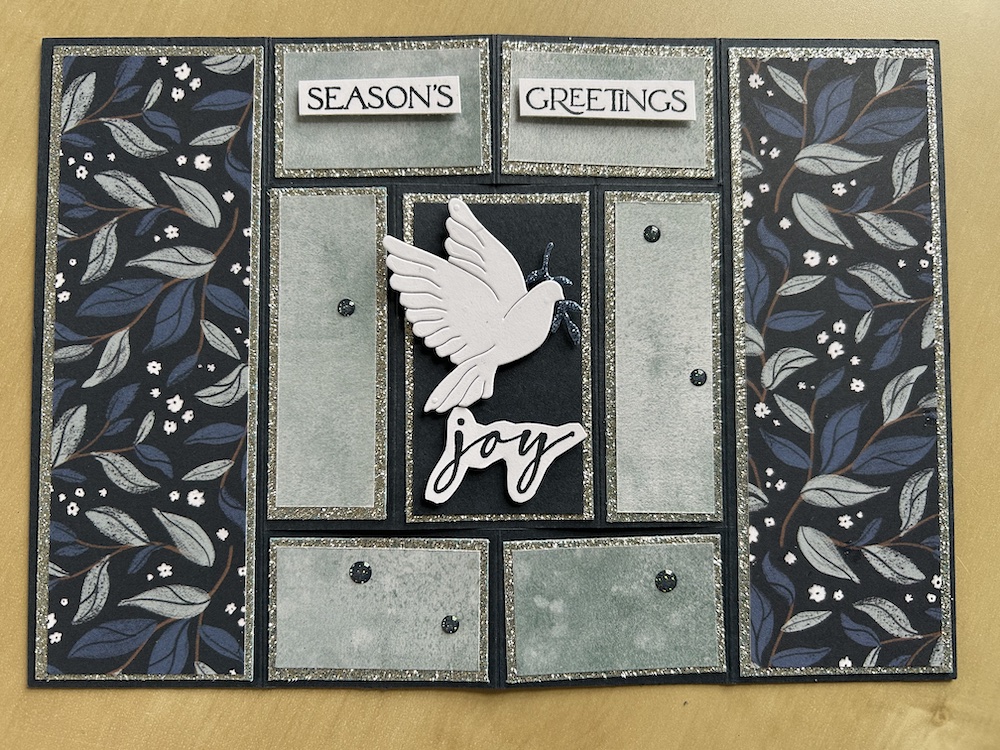 Die-cut a dove from Basic White and a tiny branch from blue glimmer paper. Stick the branch behind the dove’s beak. Add to the centre panel using a dimensional.