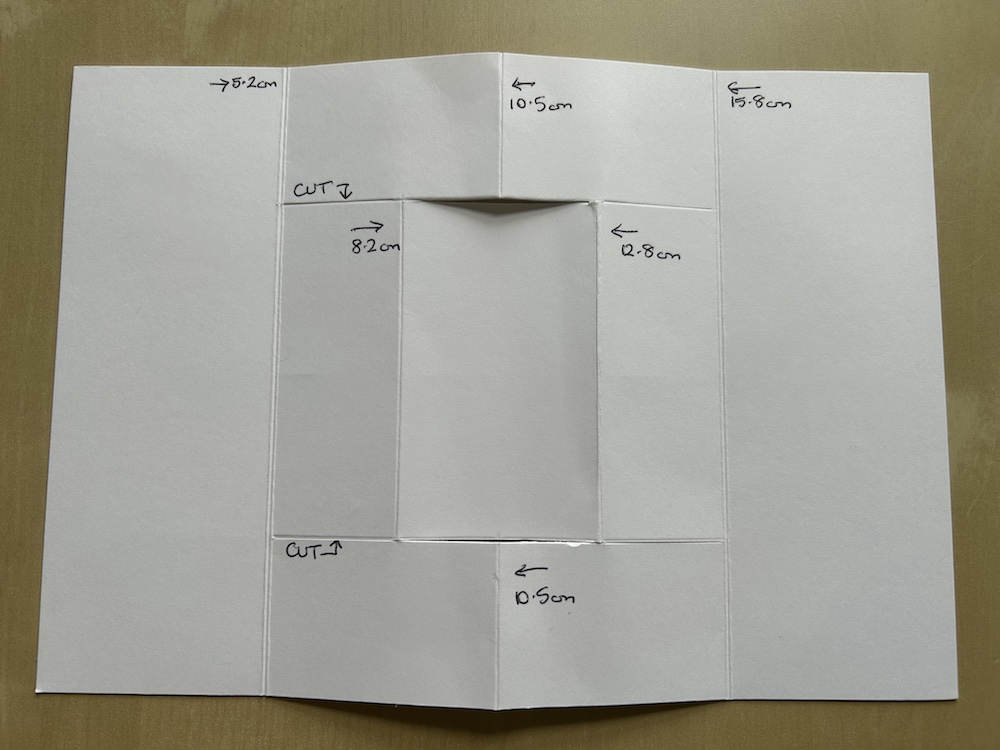 Score the card base (shown below in white for clarity) at 5.2cm and 15.8cm (or 5.2cm from the other side).