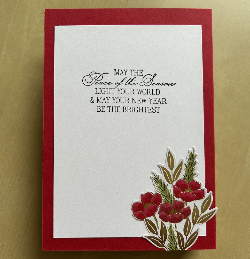 I die-cut a flower bouquet from the Traditions of Christmas DSP using the die-cut from the Christmas Greenery bundle. I also die-cut two more partial bouquets to decorate the back of my column fun fold card and the envelope.