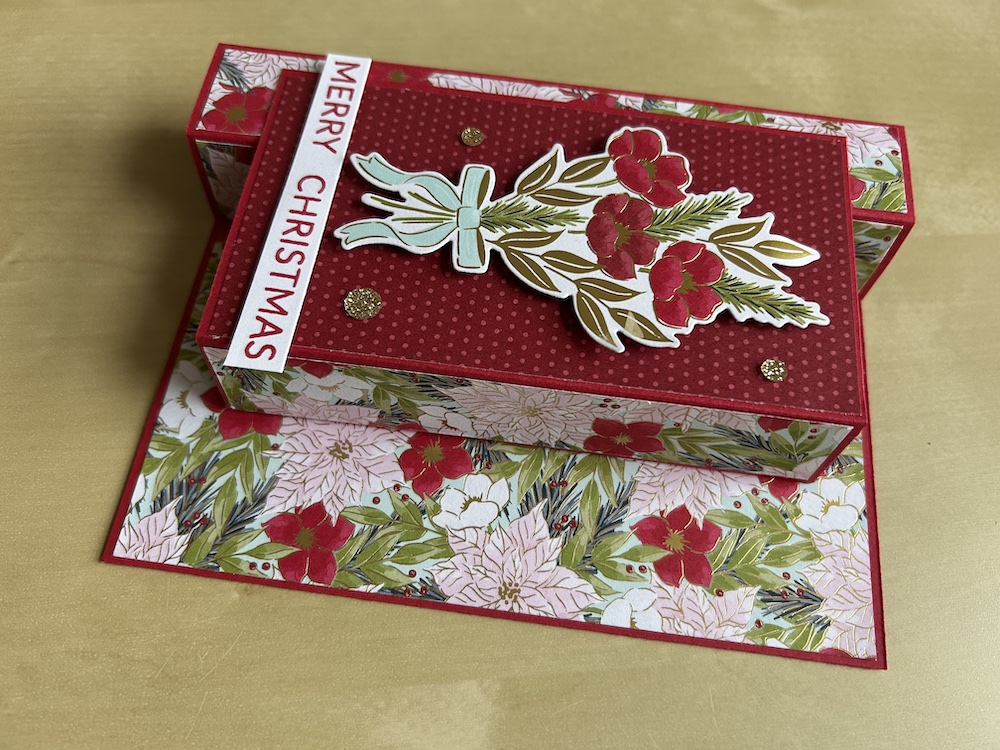 Here is another easy fun fold to make for Christmas. It has very little stamping, with the decoration provided by the gorgeous Traditions of Christmas Designer Series Paper. The card is named for the column that pops up to the left of the card and allows it to stand for display, with a centre pop-up panel containing the decoration and sentiment. There is space for writing a greeting on the reverse of the card.