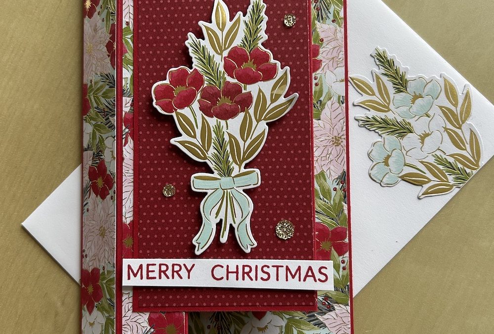 I die-cut a flower bouquet from the Traditions of Christmas DSP using the die-cut from the Christmas Greenery bundle. I also die-cut two more partial bouquets to decorate the back of my column fun fold card and the envelope.