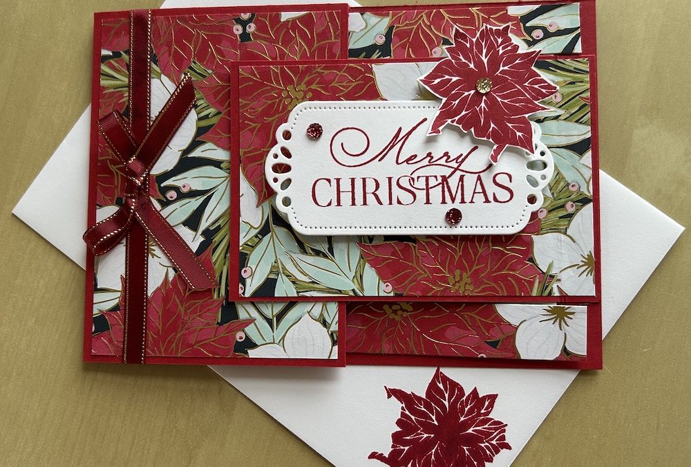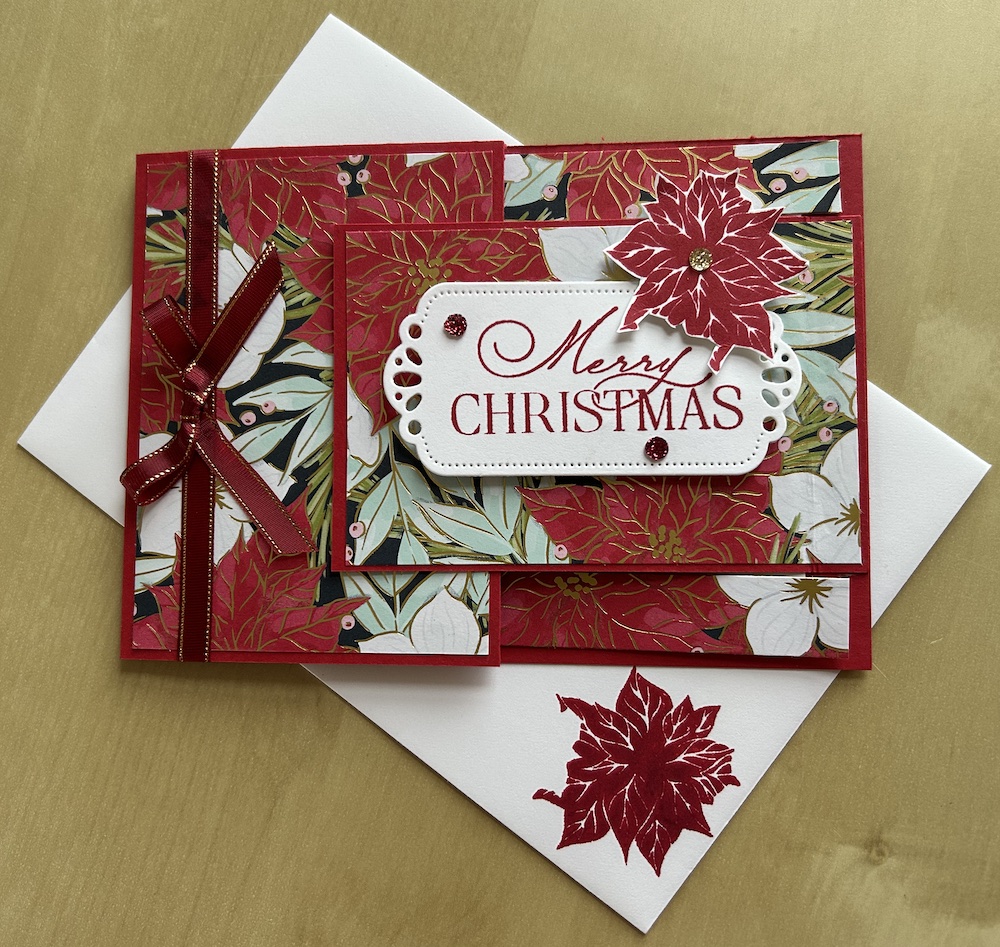 I used products from the gorgeous Traditions of Christmas suite for this card. The pointsetta is from the Christmas Greenery stamp set. The sparkling sequins are fabulous and the specialty DSP is to die for! The sentiment I used is from the retired Brightest Glow stamp set. The gold edged ribbon I used is still available, I think.