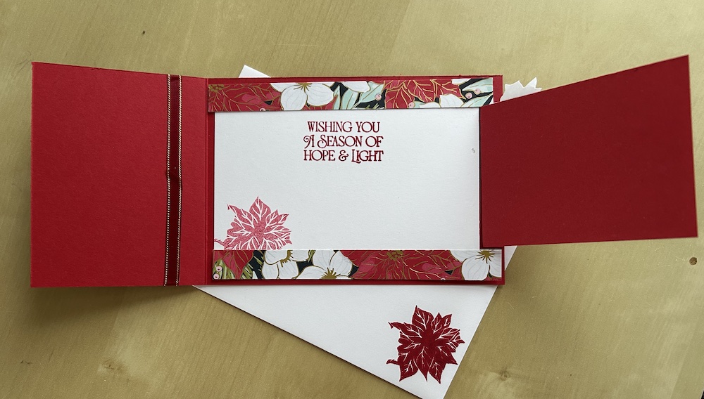 If you want, adhere the optional two strips of DSP at the top and the bottom on the card inside so they cover up the white section visible above and below the fun fold panel – I could not decide which look I preferred so we decided during the free Craftalong!