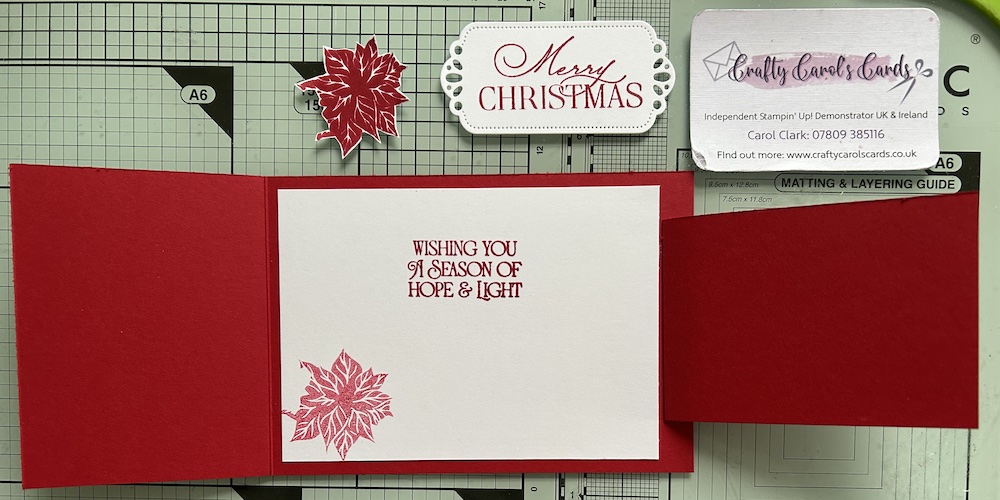 Stamp a sentiment and any decoration you want inside the card onto this piece and adhere inside your card, lining it up with a small border at the inner edge and leaving room to attach the fun fold panel (1cm or ½”) on the outside edge using tear & tape. It should look like this when open: