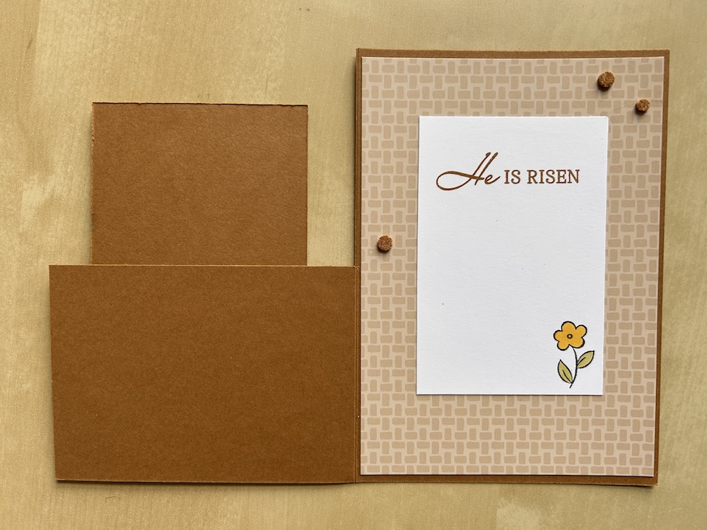 Stamp a greeting in Pecan Pie on the Basic White inside panel. Add further decorative stamping as you wish and colour if necessary. Stick inside the card so it is central between the sides and slightly nearer the top than the bottom. See the video if you are unsure.