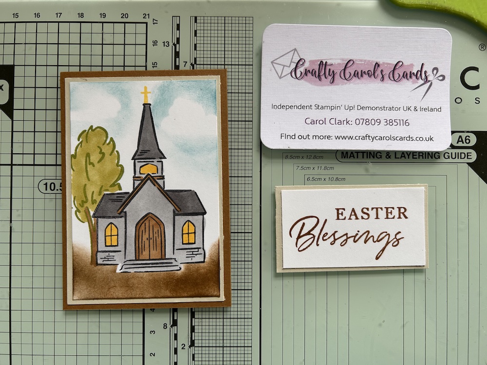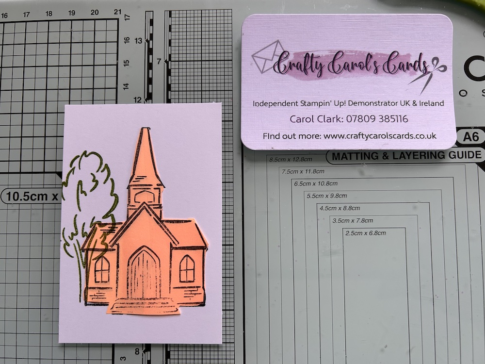 Now stamp the tree in Old Olive so it sits to the right of the church. The mask prevents ink going where you don’t want it!