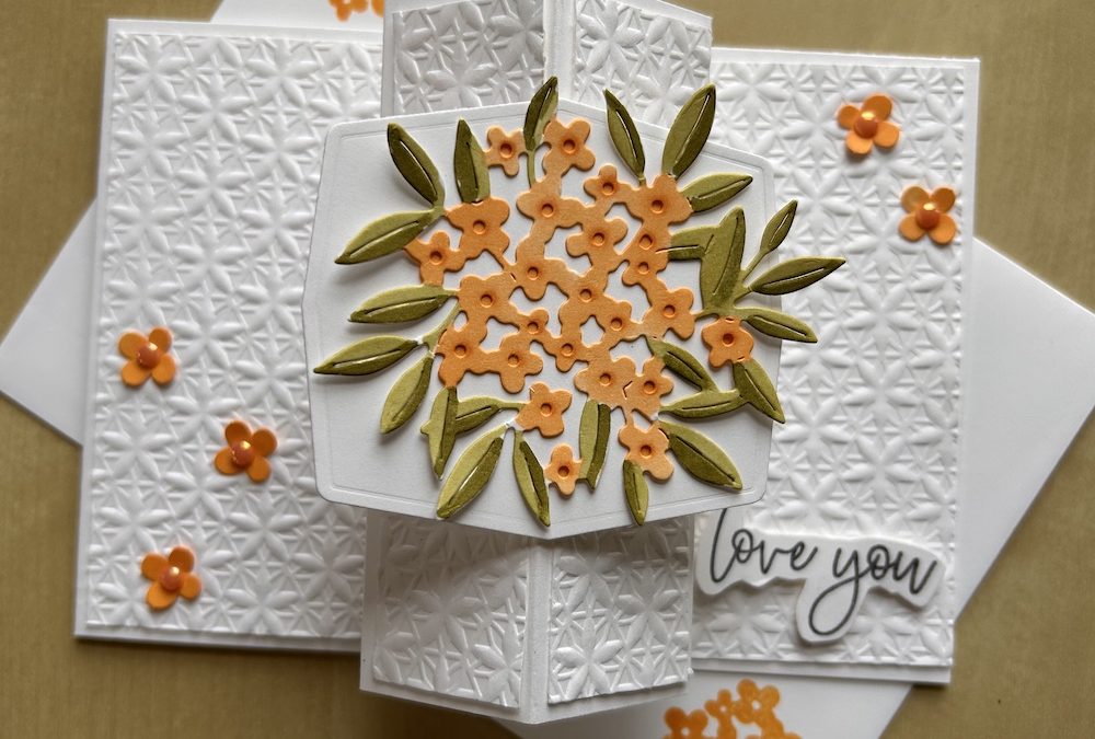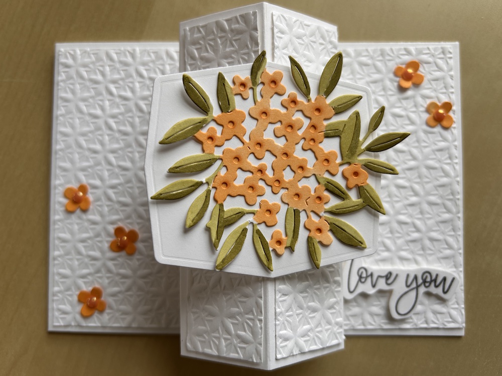 Stick this piece flat to the frame, then add the frame to the card front by adding adhesive to the tabs. (I added some dark Peach Pie blend centres to my flowers once stuck to the frame.)