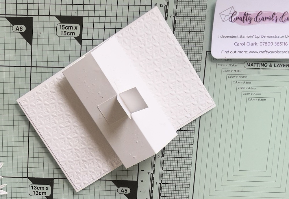 Mark a centre line on the card front at 7.4cm (2¾”) with a pencil through your trimmer channel in the centre of the card.