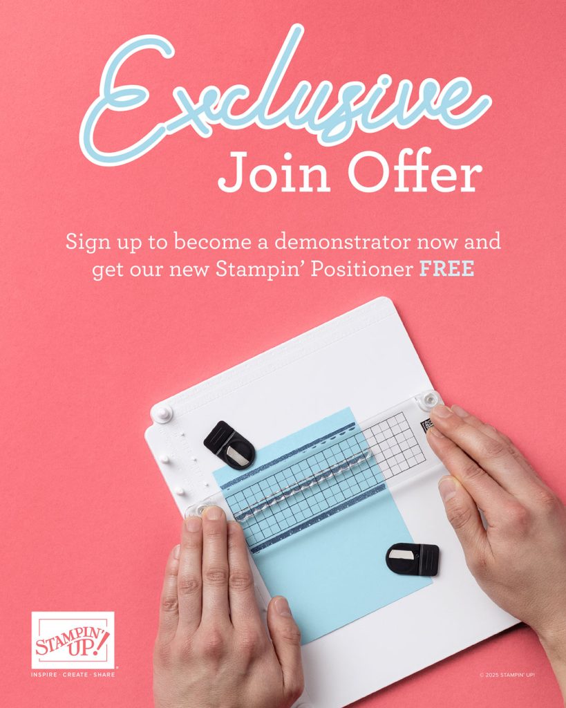 Now is the best time to join. Not just for the amazing Stampin’ Positioner, but also for all the amazing perks that come with being a demonstrator, like a 20–25% product discount, exclusive early access to the latest releases and catalogues, the opportunity to earn a modest supplemental income, the chance to attend incredible training and crafting events, and so much more!  Get in touch if you want to know more or visit my Join Me page for more information.
