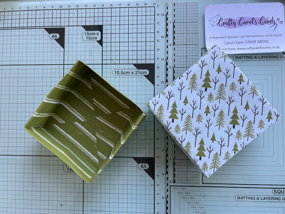 I have made these square boxes in three sizes, 6cm (2 3/8”), 8.5cm (3 1/4”) and 11cm (4 3/8”) ,all from simple squares of Designer Series Paper. The lids fit snugly, and they will fit a variety of small gifts.