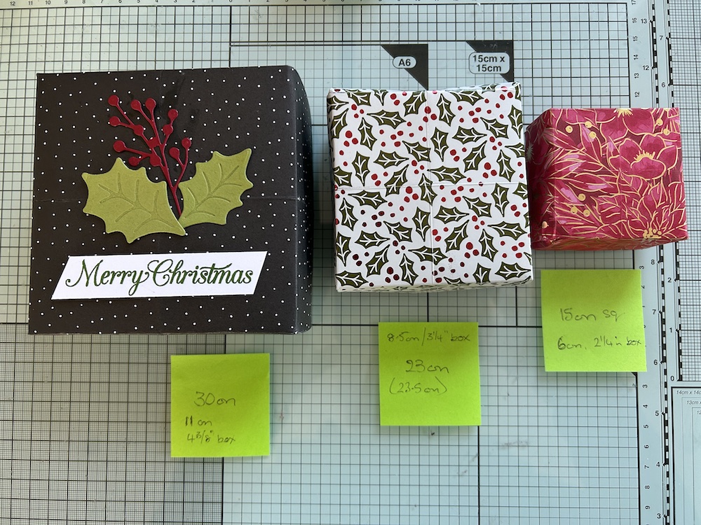 The video and the pictures show me making the middle-sized box using 23cm (9″) square DSP for the base and 23.5cm (9 1/4″) square DSP for the lid. But you can use any size DSP you wish – the finished box will measure just over 1/3rd of the DSP size. The lids and the bases are made in exactly the same way.