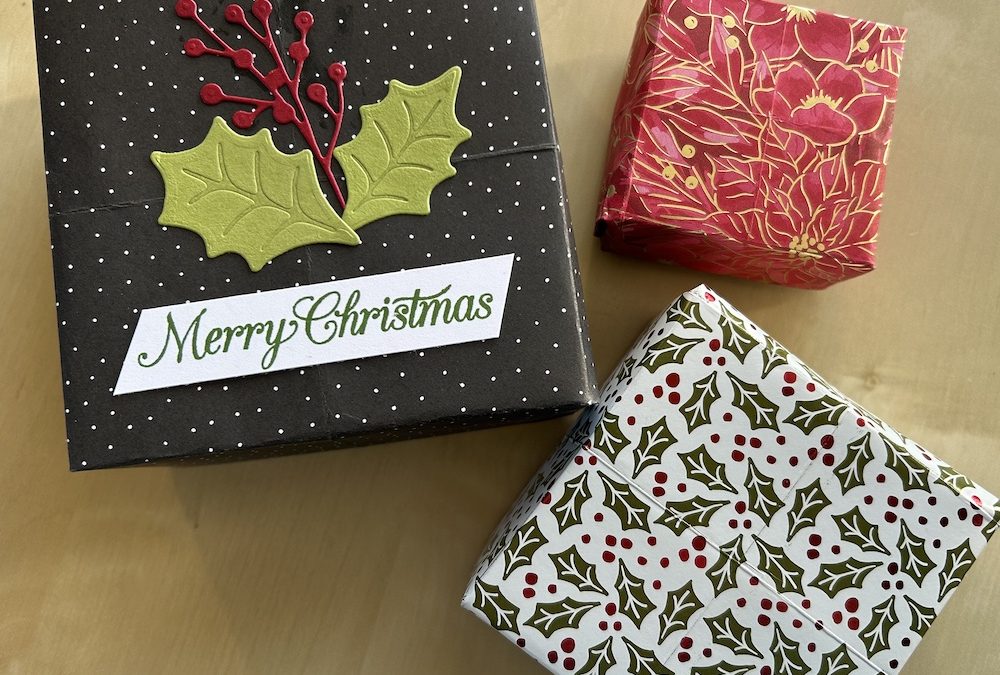 I have made these square boxes in three sizes, 6cm (2 3/8”), 8.5cm (3 1/4”) and 11cm (4 3/8”) ,all from simple squares of Designer Series Paper. The lids fit snugly, and they will fit a variety of small gifts.