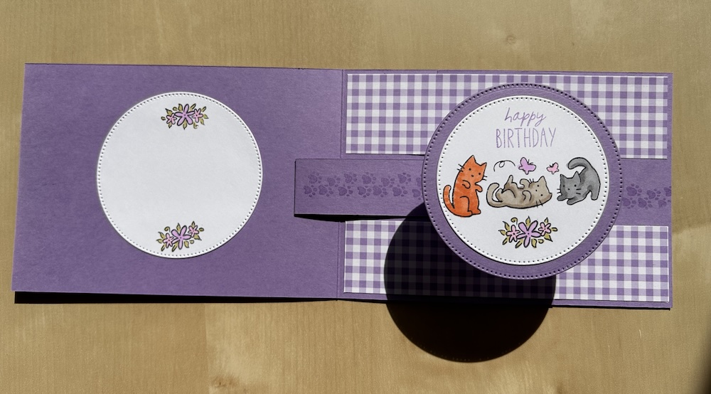Colour the cats as you wish. I used Timid Tiger, Smoky Slate, Grey Granite, Cloud Cover and Crumb Cake, plus Petunia Pop and Bubble Bath for the butterflies.