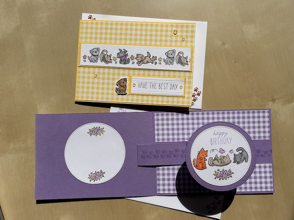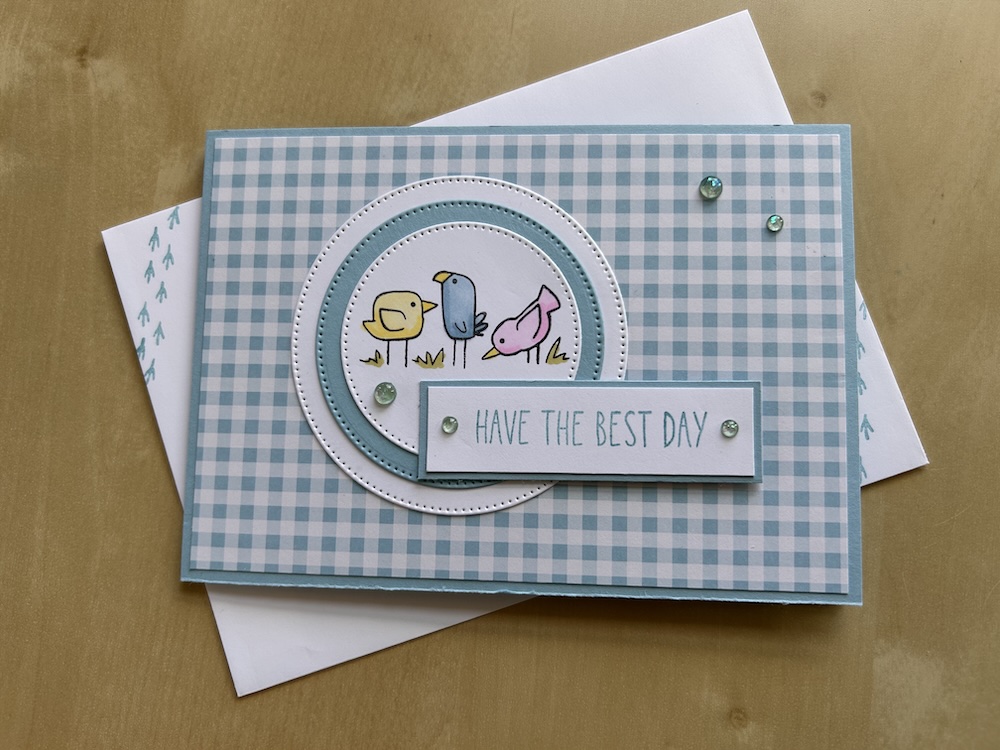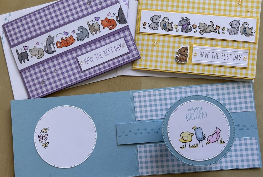 I made three, using the different animal and bird images in the Cutest Crew stamp set. You can see the bird version in the video below. I used some retired Gingham Gala DSP for these cards.