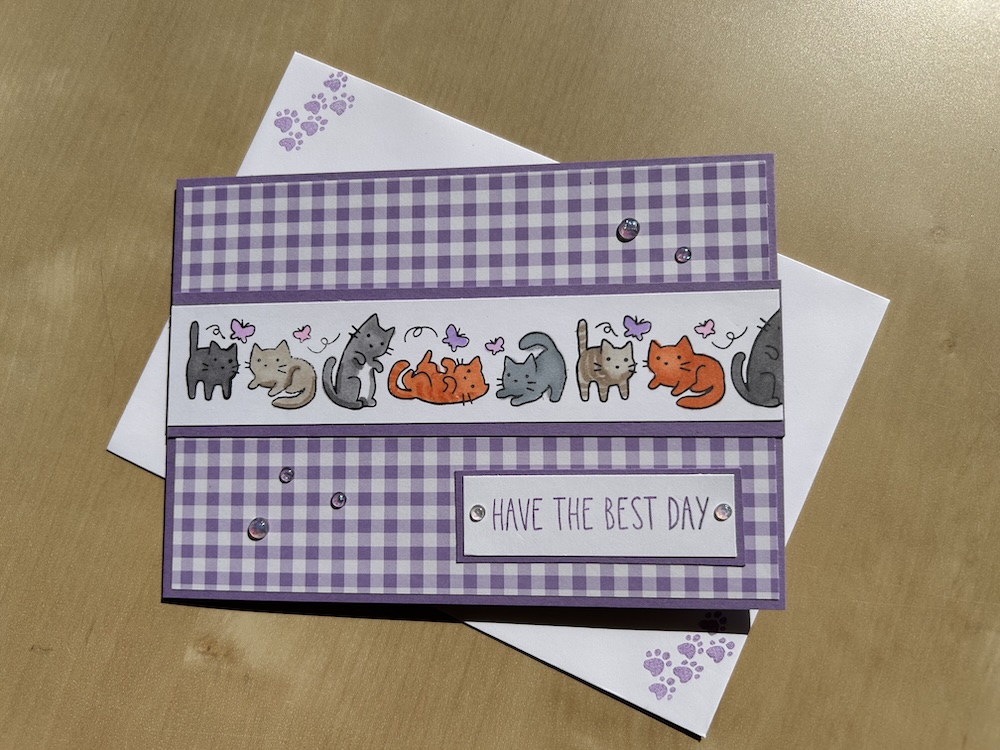 Stamp the cats onto the Basic White strip for the front of the card. You will need to stamp them twice to fill in the panel.