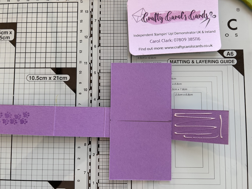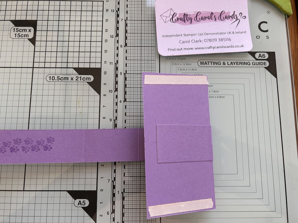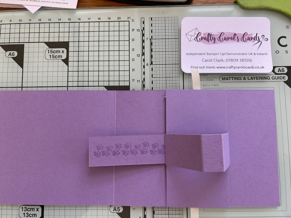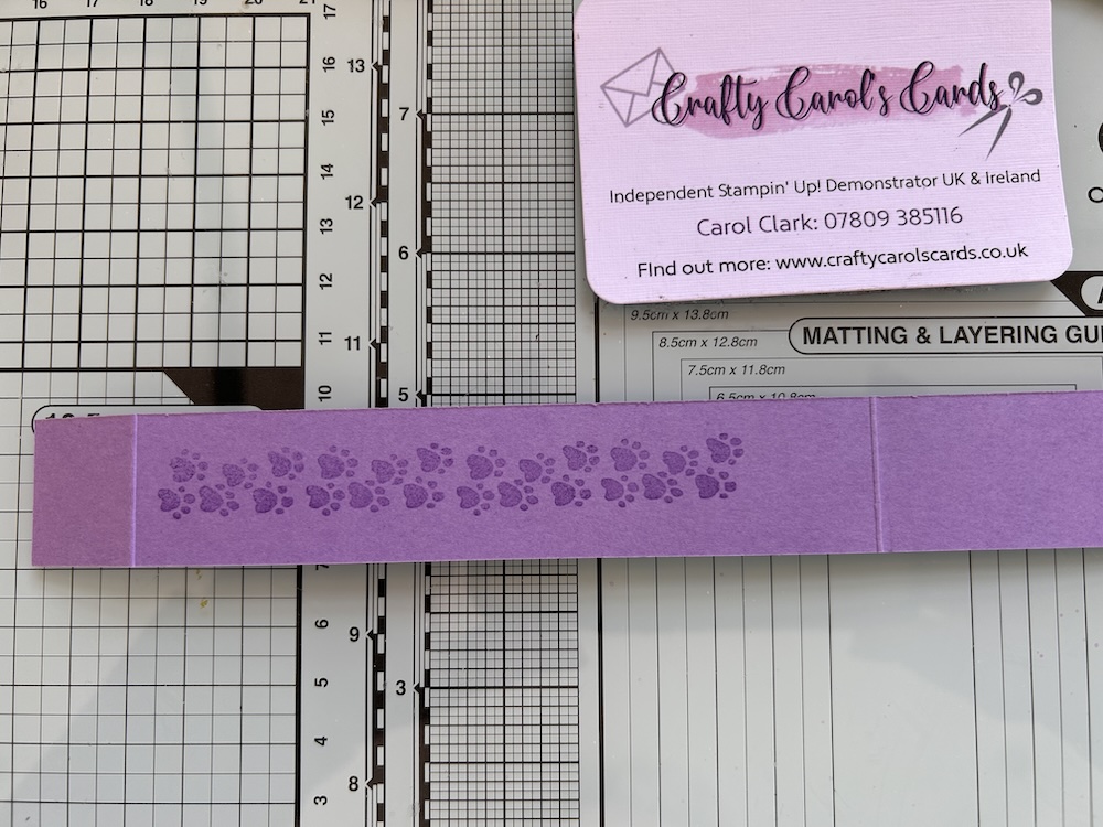 Stamp the paws image across the largest section of the strip in a coordinating ink as in the picture – see the video if you are unsure.