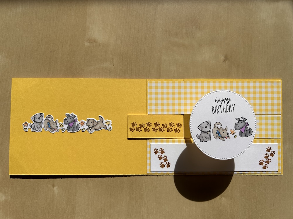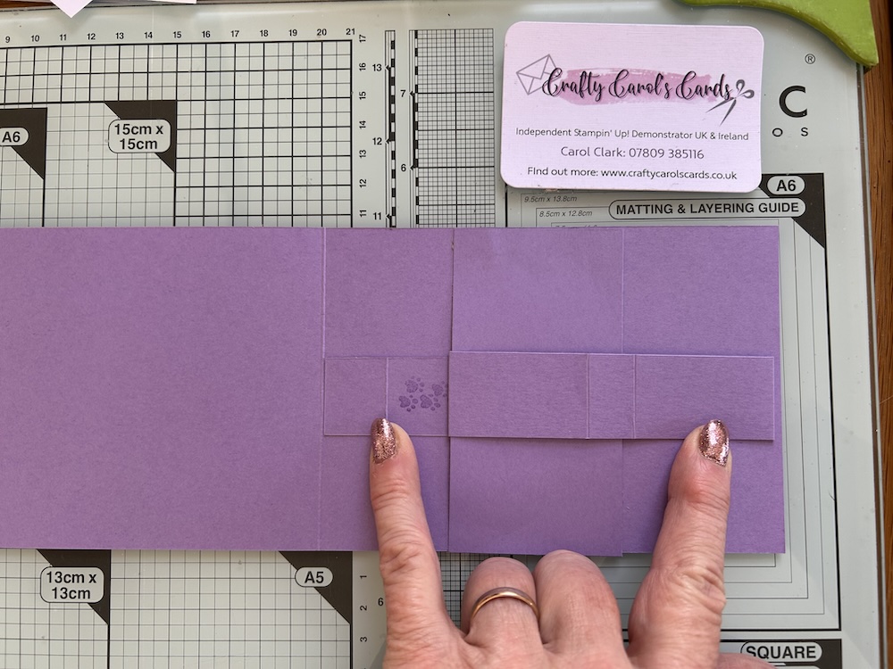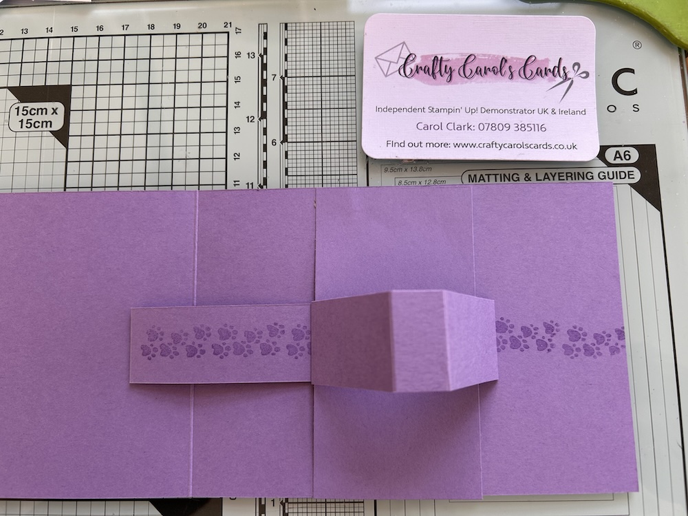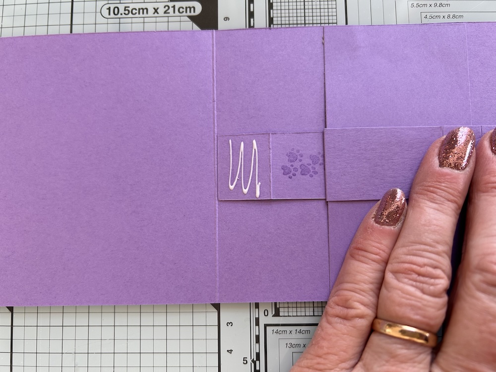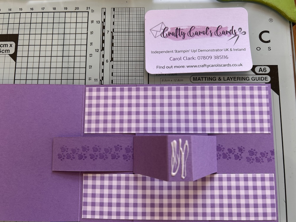 Stamp the paws image across the largest section of the strip in a coordinating ink as in the picture – see the video if you are unsure.
